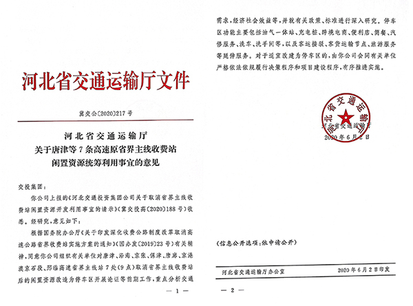 为了盘活闲置资源,2020年6月2日,河北省交通运输厅作出《河北省交通运输厅关于唐津等7条高速原省界主线收费站闲置资源统筹利用事宜的意见》(冀交公〔2020〕217号)(以下简称217号文件),同意交投集团“组织有关单位对唐津、沿海、京张、保津、唐廊、京港澳京石段、邢临高速省界主线站7处(9点)取消省界收费站后的闲置资源改造为停车区开展论证等前期工作”。