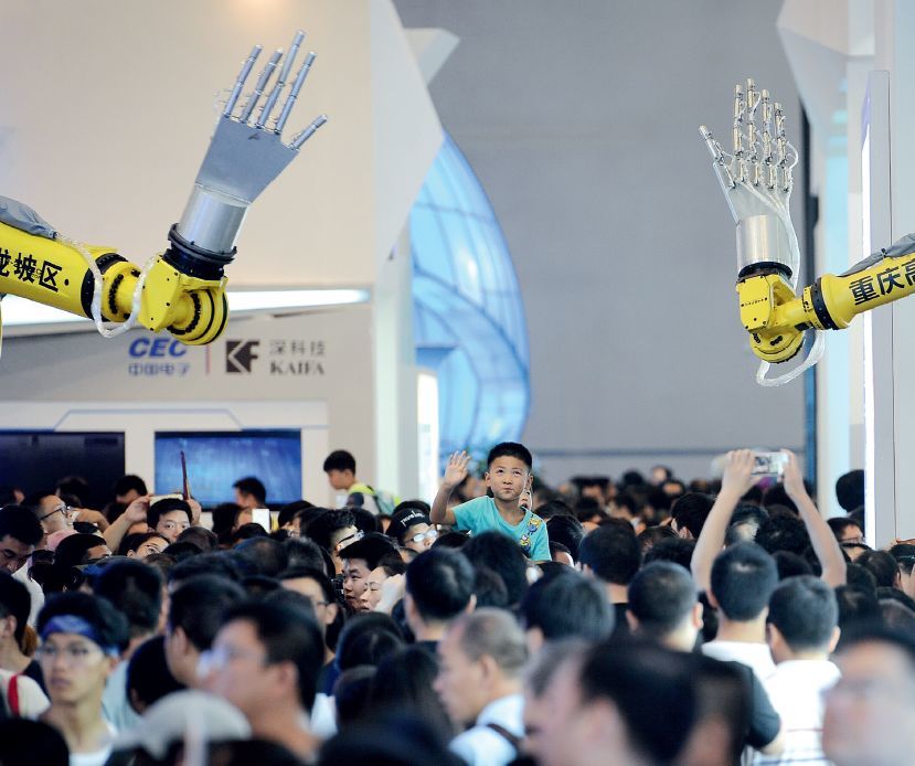 2018年8月,重庆一场国际智能产业博览会上的机器人手臂。图/视觉中国