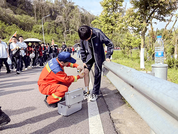 一路上,华岩救援队的队员们在副队长周静的指挥下,分成8个小组,手提急救包穿插在行进的队伍中,为扭伤、擦伤、低血糖、腿抽筋和轻度中暑等身体不适的同学提供应急处置及保障服务,队员们还不时为落后的同学们加油鼓劲。