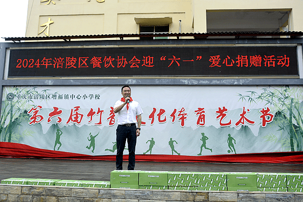 涪陵区人大常委、民建涪陵区委副主委、涪陵区餐饮(商)协会会长、川东坝子董事长刘明杰代表爱心人士发言,展现了爱心企业的责任与担当。