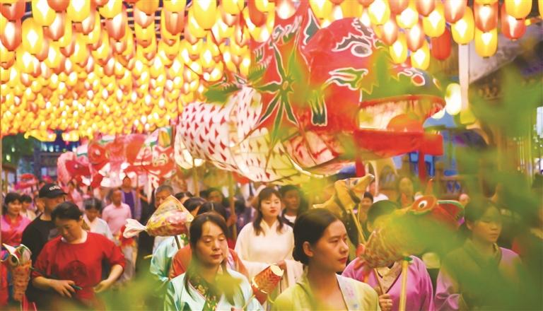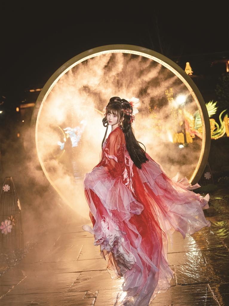 梦里老家景区在这个夏夜还推出了“不灭的烛火”“非遗滚灯舞苍穹”“大鱼海棠(徽州鱼灯)”“非遗烧塔”“甩铁花”“韩熙载夜宴图”“进士选妻”等全新的演艺节目。