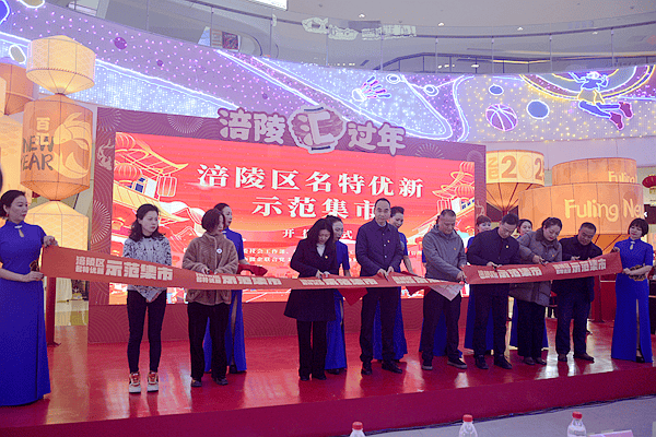 涪陵区市场监督管理局党组书记、局长廖国江,党组副书记文何伟,涪陵区委社会工作部副部长张沥,涪陵区小微企业联合党支部书记傅以伦,涪陵区微型企业协会会长王佳容,涪陵百汇广场总经理陈晓未,重庆市涪陵区宏吉肉类食品有限公司党支部书记、董事长胡春玲,重庆市涪陵粮油行业协会会长刘文学等领导与企业家代表手持金剪,共同为集市剪彩。