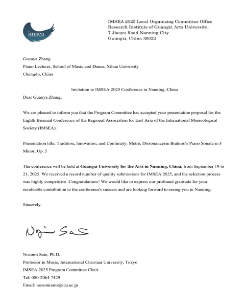 我们期待张冠亚博士在IMSEA 2025大会上的精彩报告,也期待西华大学音乐与舞蹈学院在未来涌现更多优秀科研成果,持续为中国与世界音乐学术交流贡献力量。